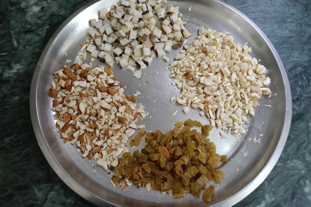 4. Roughly chop all the nuts and dry fruits in a platter.