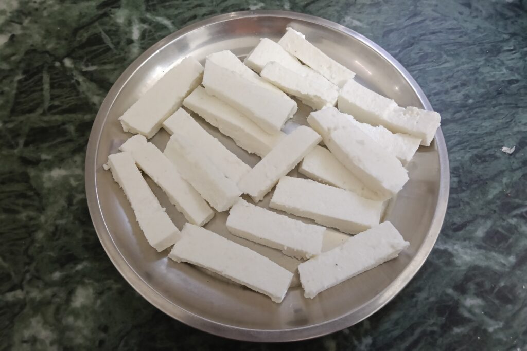 - Cut the paneer in the long rectangular shape.