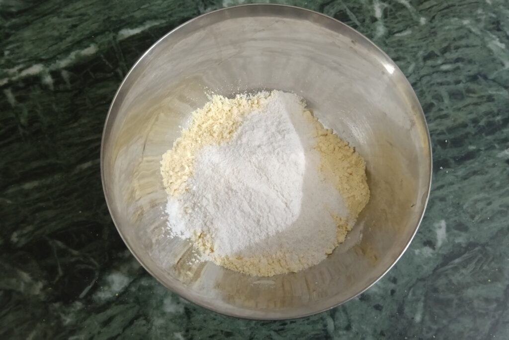 2. In a bowl, add 3 tbsp of gram flour and 1 tbsp of rice flour.