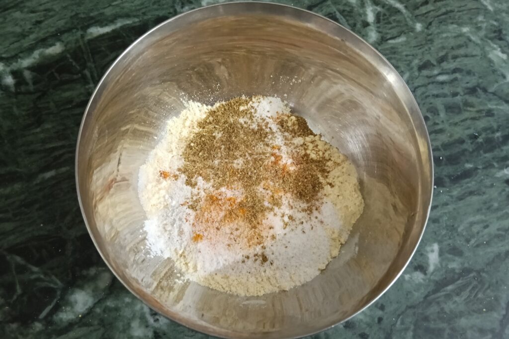 - In a bowl take gramflour and rice flour with spices: garam masala, turmeric powder, salt, and red chili powder.