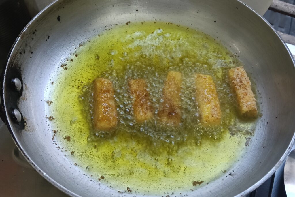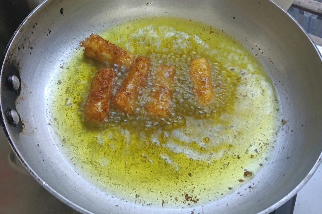 8. Heat oil in a pan on medium to high heat. Drop the coated sticks into the heated oil. Fry them on medium heat.