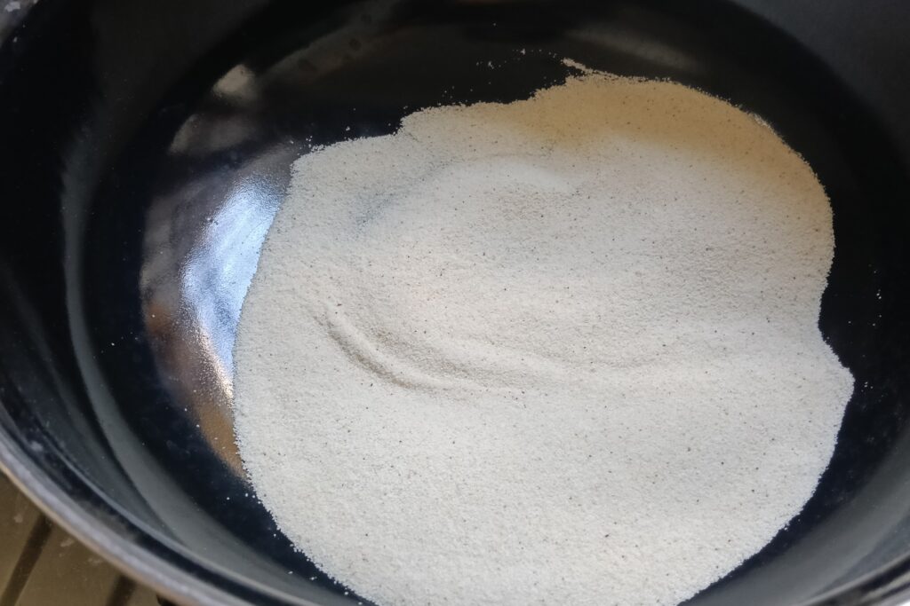- When the boil comes, add roasted semolina, stirring continuously.