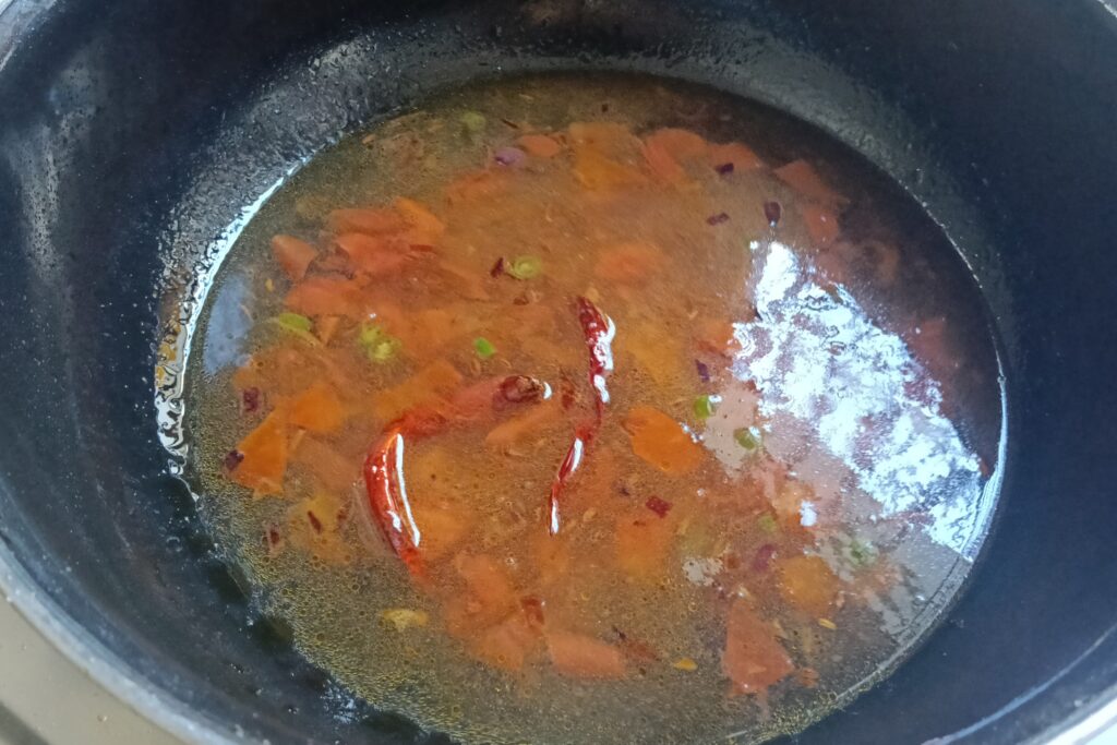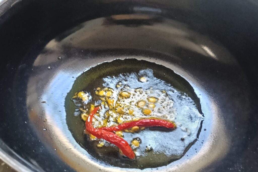 - Heat a kadai, add oil with cumin or mustard seeds, dried chili, and dal. Let them crackle.