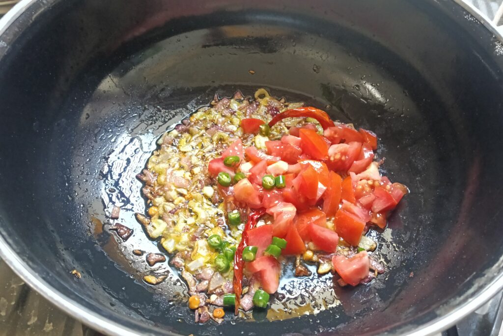 5. When the onion reaches a golden color, add chopped tomato or green chilies to it.