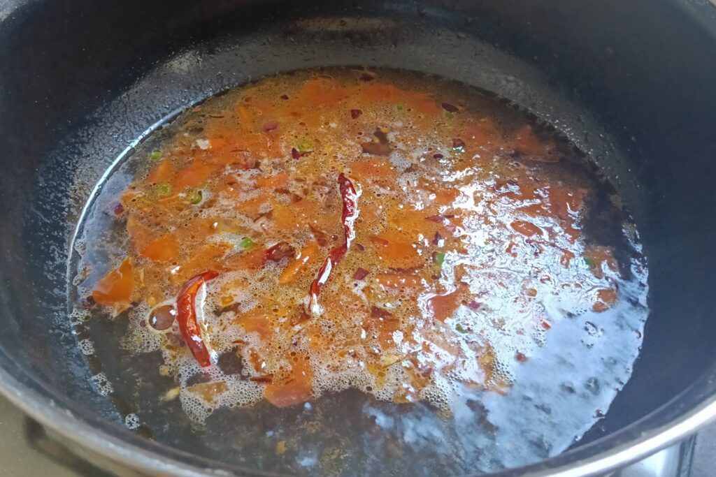 - Tempering- Cumin seeds, urad dal, chana dal, and dried red chilies.